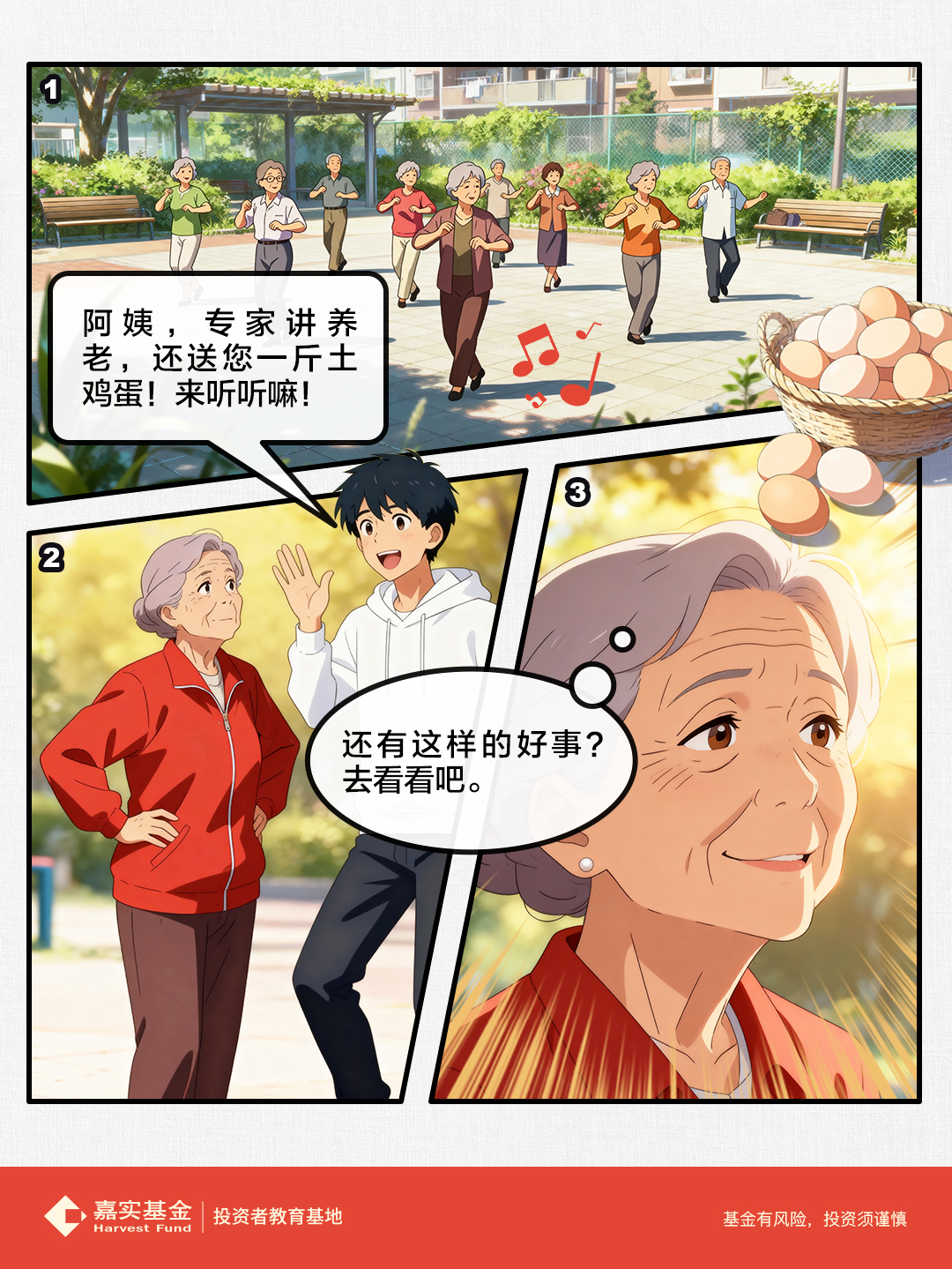 在投教形式创新上,嘉实基金十分注重高频、生活化的养老陪伴,将投教内容融入多元生活场景。以长图漫画形式围绕运动、美食、星座、民俗、职场等主题推出10期养老投教内容,累计阅读量超6万;在抖音、视频号等平台发布近30条养老投教短视频,总播放量突破200万,互动量超10万次。同时,为融合传统文化与养老理念,于重阳节期间创意策划三期“古代画卷”系列短视频,通过“陪伴、配置、长期力量”三个故事传达个人养老投资核心观念,该系列在抖音累计播放量已逾60万次。